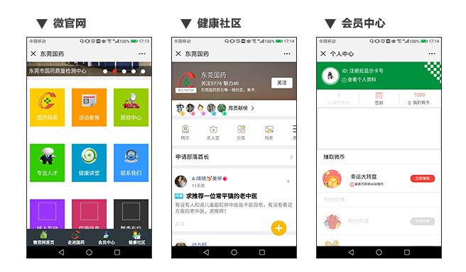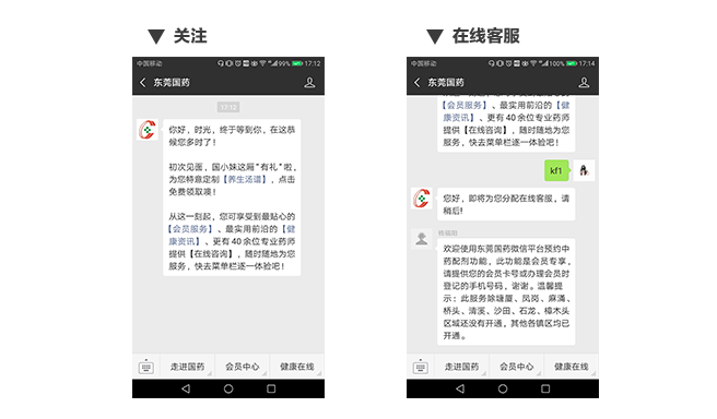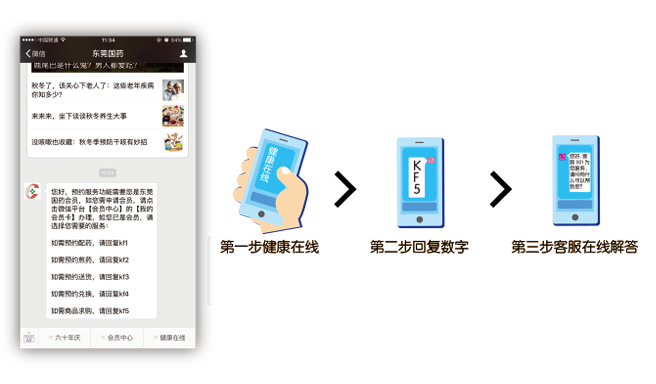 为提高东莞国药的服务质量和客户体验,除线下服务外,壹公里为东莞国药专门定制了线上微信运营服务,设置了微官网、会员卡、健康社区等,实现了在线预约,在线咨询,在线购买,在线配药煎药等专属服务。特别是线上配药煎药送药服务,为东莞国药实现了差异化突破,大大完善了服务质量和经营模式。